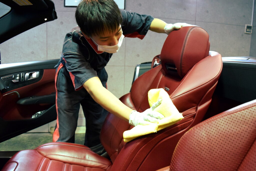 シートコーティング施工前にはコーティング被膜が定着するために、シート表面についている汚れを除去します。汚れの多くは皮膚の油脂成分が多く、これを除去することで、革・ファブリック布本来のサラっとした質感が蘇り、コーティング後の被膜が安定・定着します。