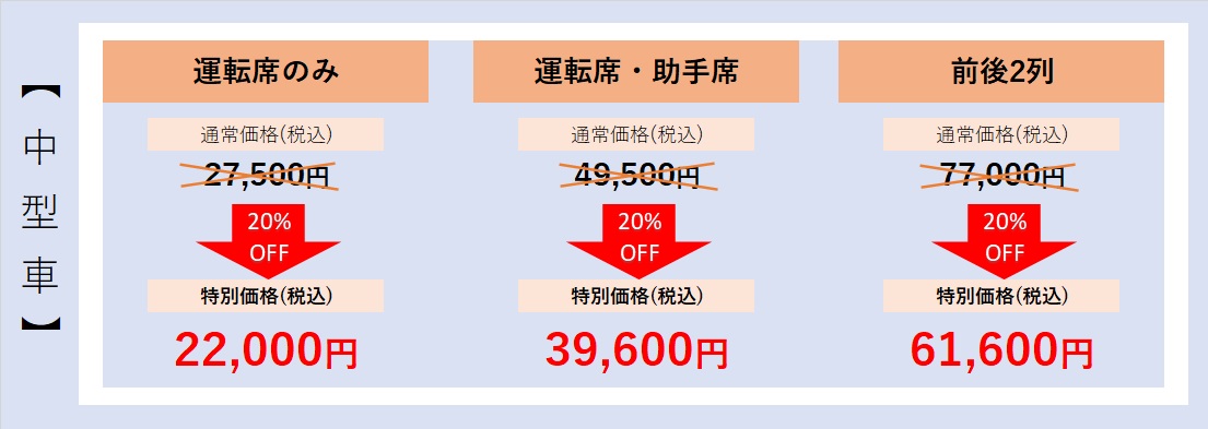 中型車(運転席/助手席) | 通常49,500円 ⇒ 特別39,600円 |