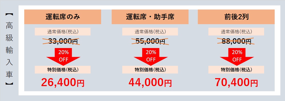 輸入車(運転席のみ) | 通常33,000円 ⇒ 特別26,400円 |