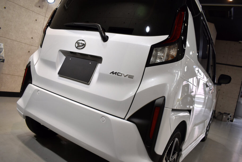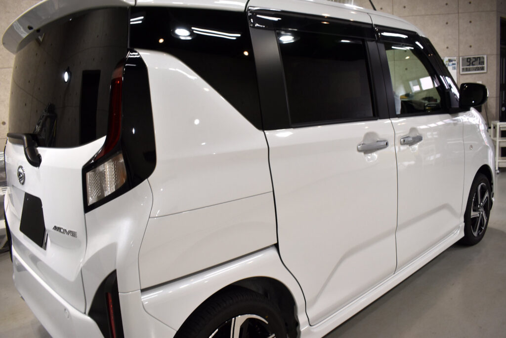 新型ムーブはデザイン性が高まったことで、ボディの輝きを長く保つメンテナンスが重要です。当店のガラスコーティングを施工すれば、新車特有の美しい艶を長期間維持でき、日々の洗車がとても楽になります。軽自動車とはいえ、日々の生活を支える大切なパートナー。だからこそ、コーティングで「新車以上の輝き」を楽しんでいただきたいと考えています。