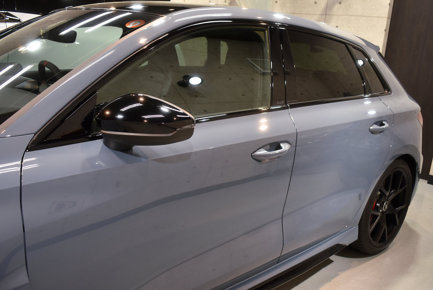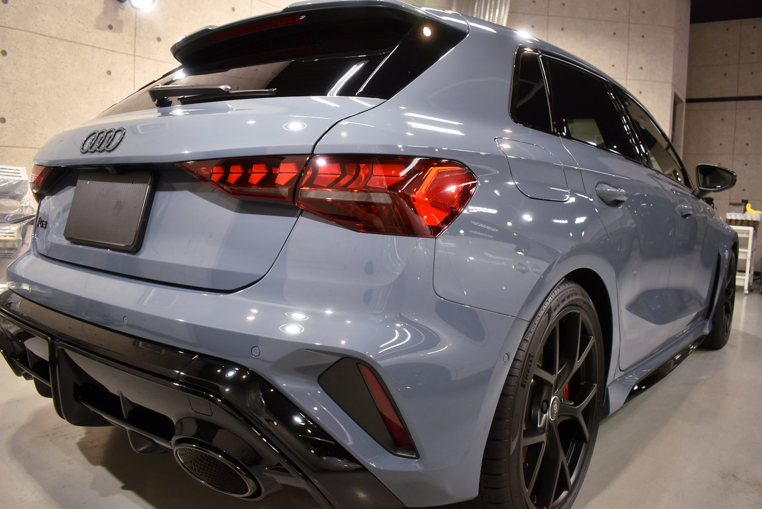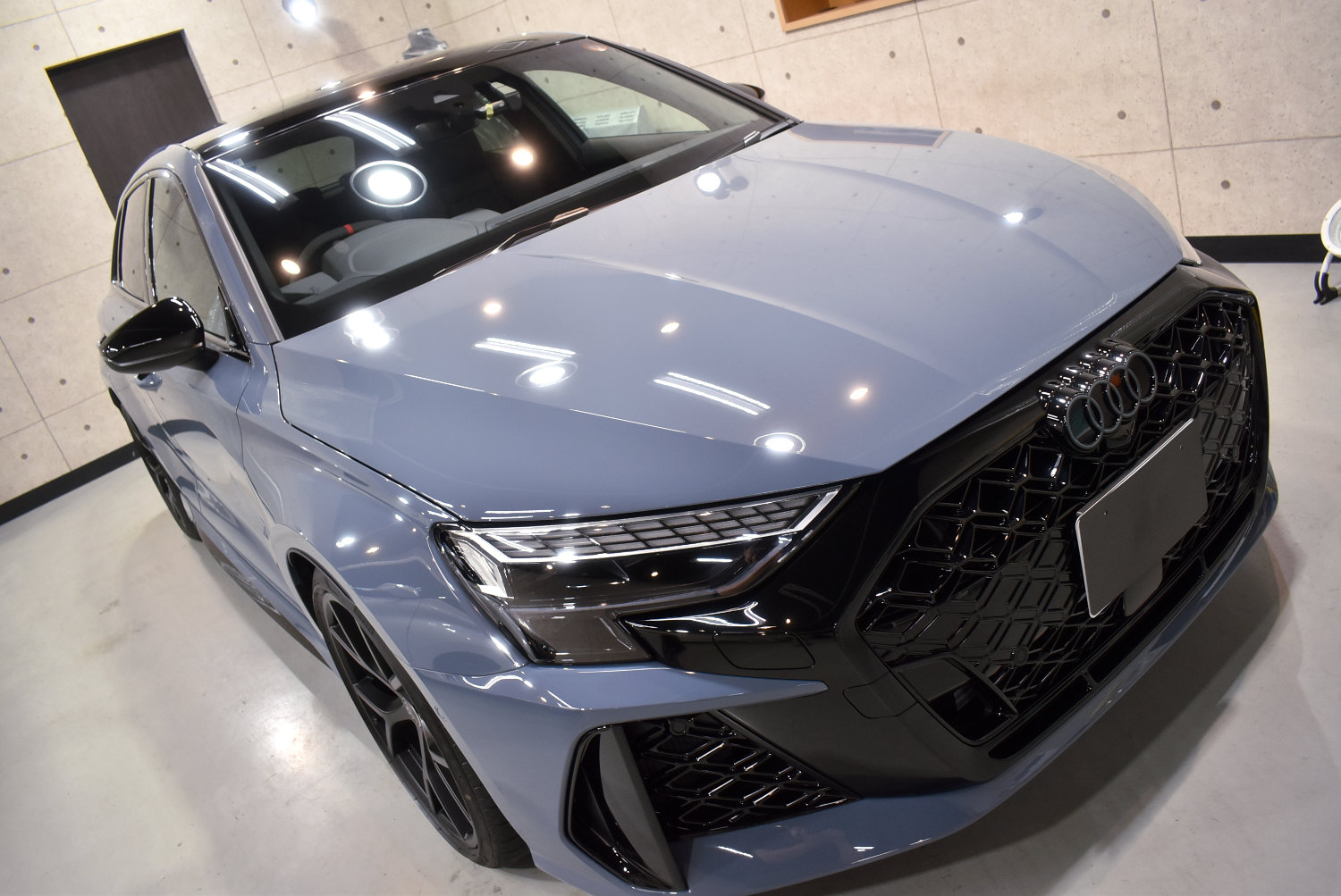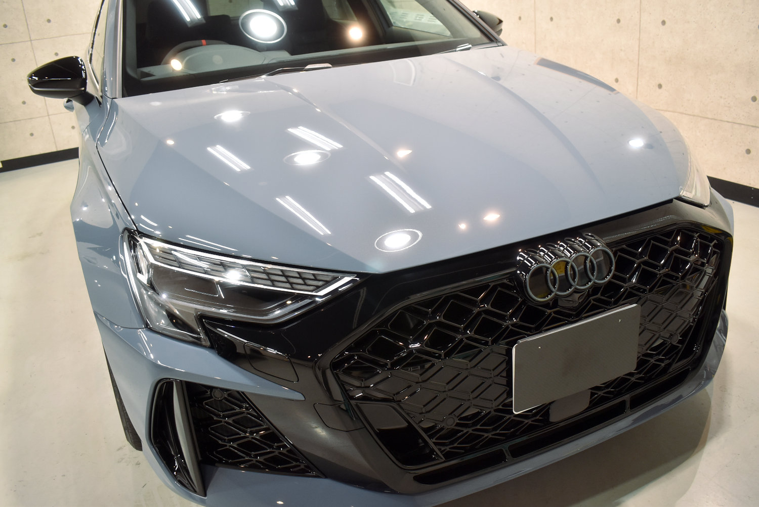 今回のRS3も、塗装表面のわずかな新車特有の曇りを丁寧に整え、塗装本来の透明感と奥行き感を引き出しました。ケモラグレーのような“曇りを含む美しさ”のある色ほど、この下地処理が最終的な艶を左右します。