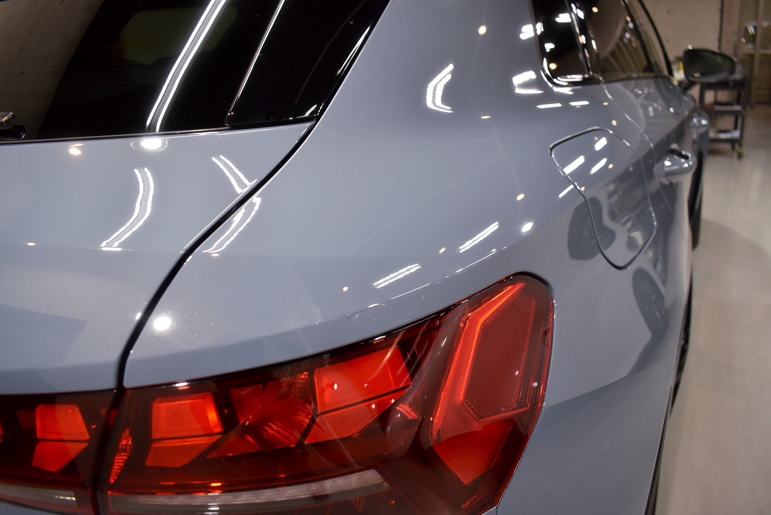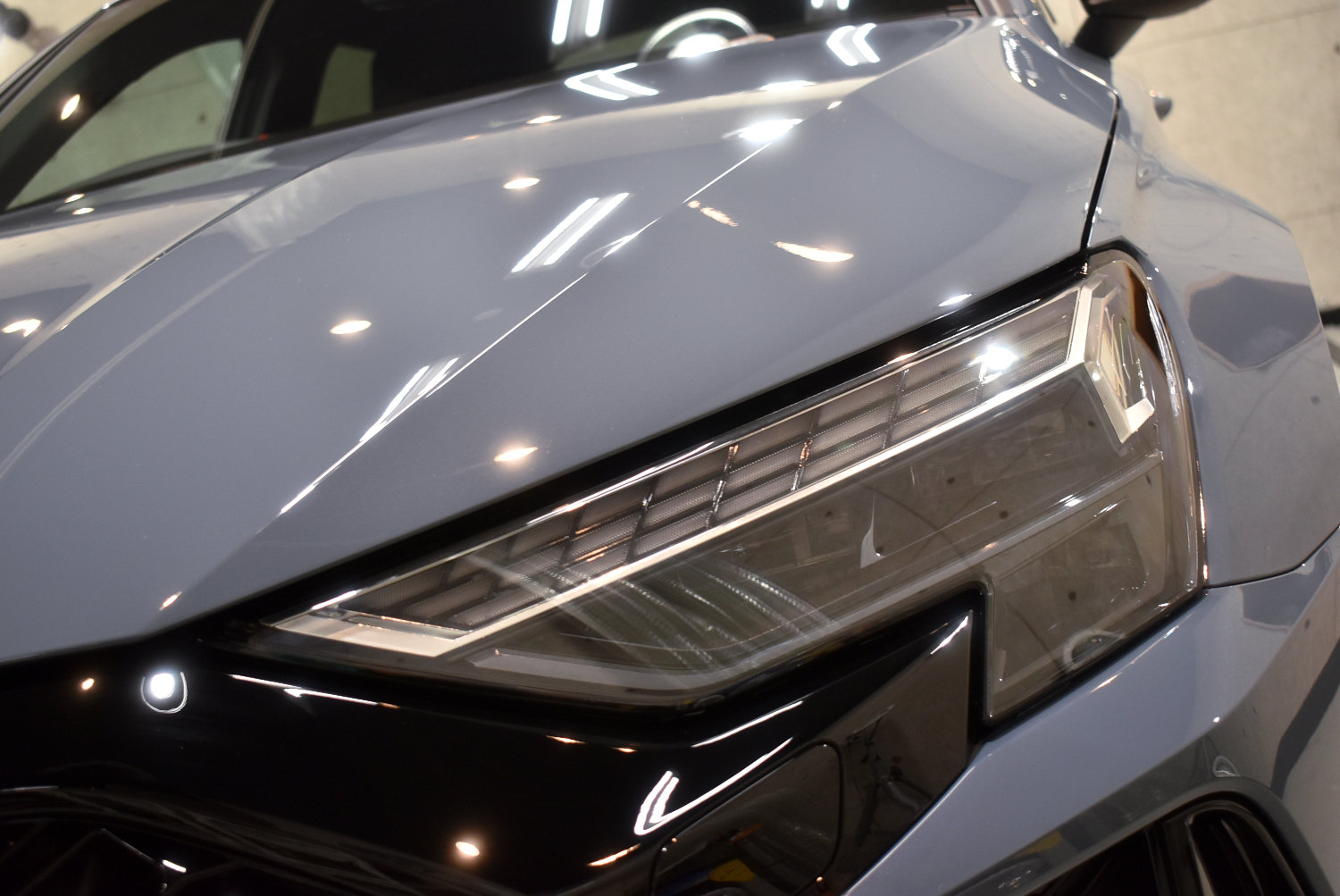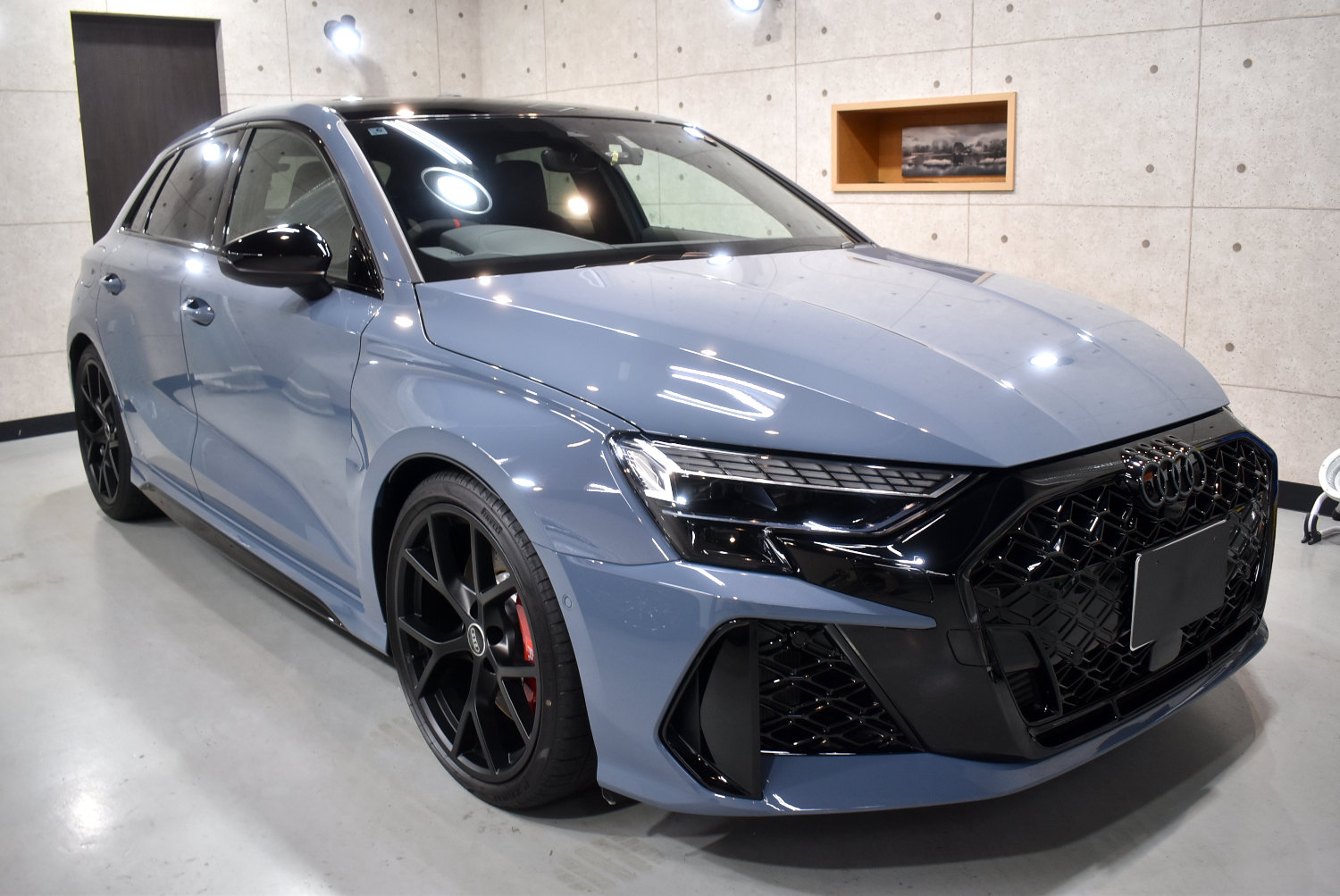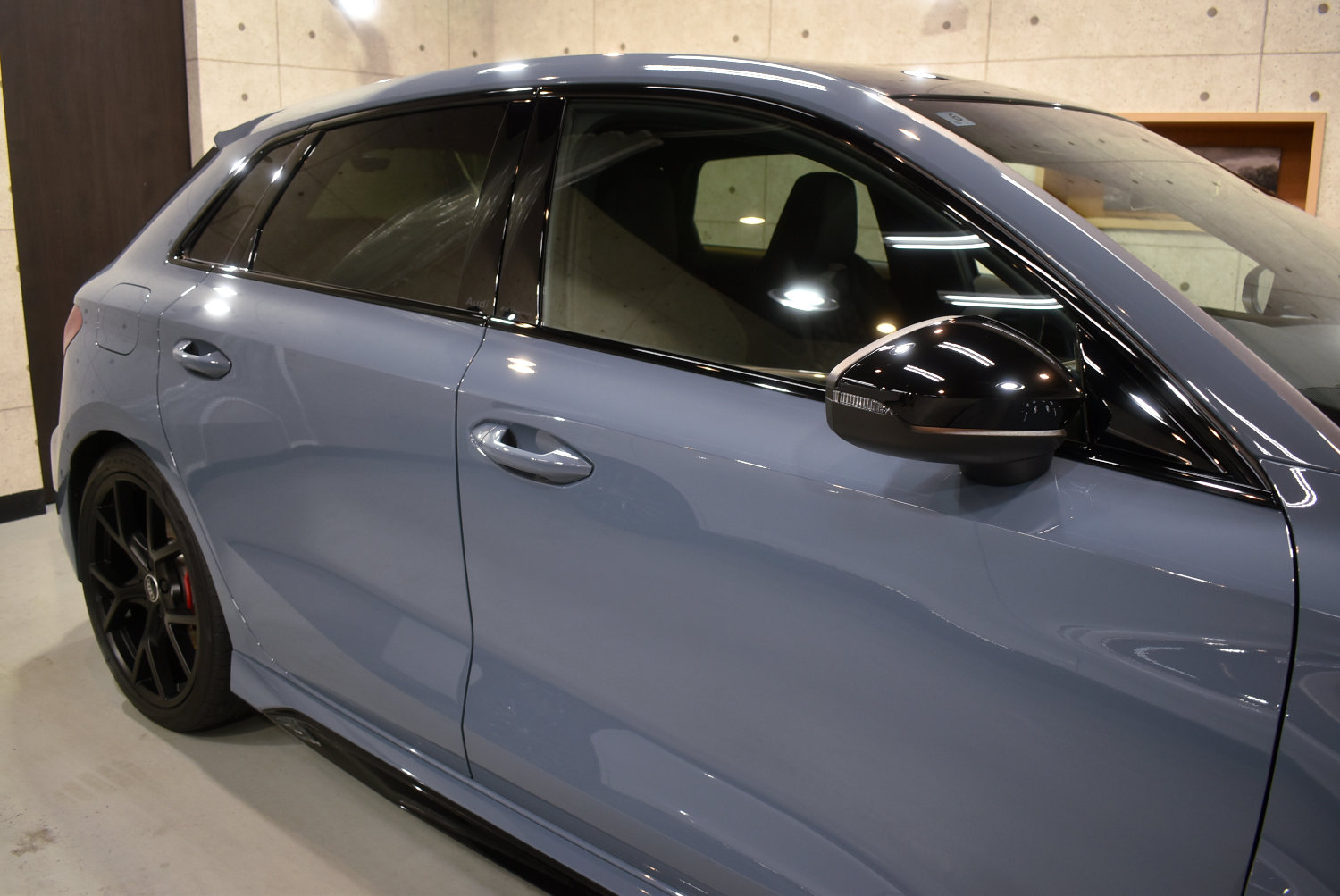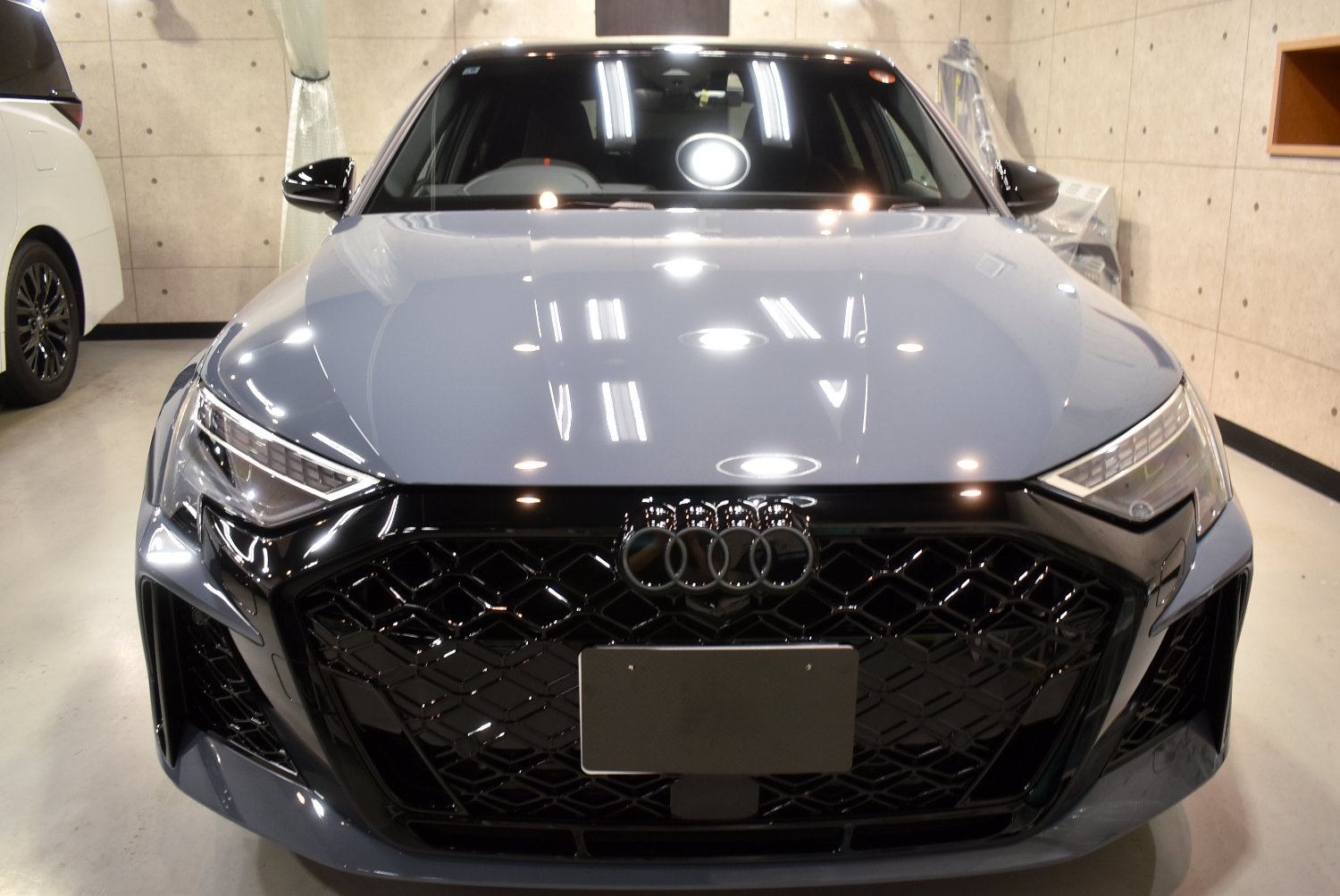 今回のRS3も、塗装表面のわずかな新車特有の曇りを丁寧に整え、塗装本来の透明感と奥行き感を引き出しました。ケモラグレーのような“曇りを含む美しさ”のある色ほど、この下地処理が最終的な艶を左右します。