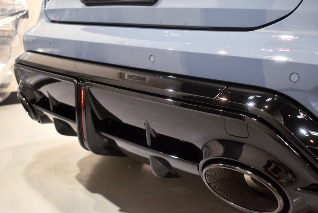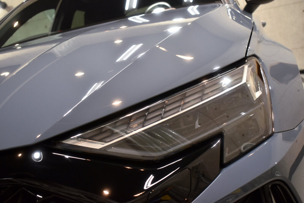 コンパクトなボディに2.5L直列5気筒ターボを搭載し最高出力400馬力、最大トルク500Nmを発生させます。まさに「羊の皮をかぶった狼」と呼ぶにふさわしい1台です。スポーティーさと上質さを兼ね備えたデザインは、街中でも際立ちます。特に今回のボディカラー「ケモラグレー(Kemora Gray)」は、近年のアウディが得意とするくすみ系のグレートーン。照明の当たり方や天候によって、ガンメタにもシルバーにも見える独特の深みを持っています。マットではないものの、やや落ち着いた質感のため、光沢と艶を最大限に引き出すコーティングがとても効果的です。