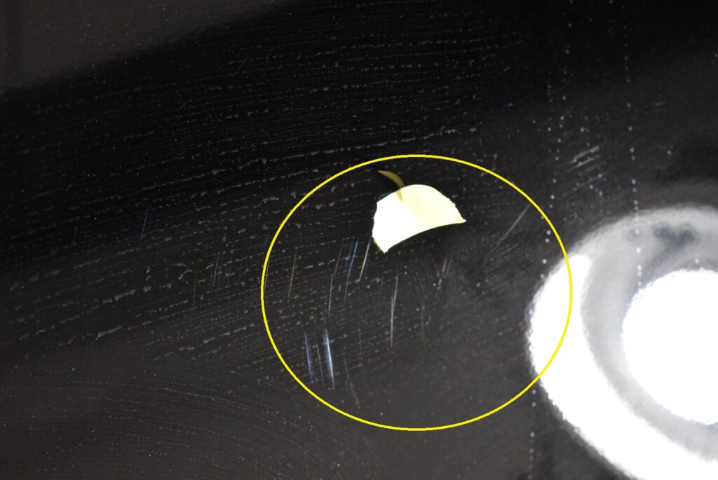 入庫時に塗装面を確認すると、「保護シートの糊跡」がリアスポイラーのパネルに残っている状態でした。