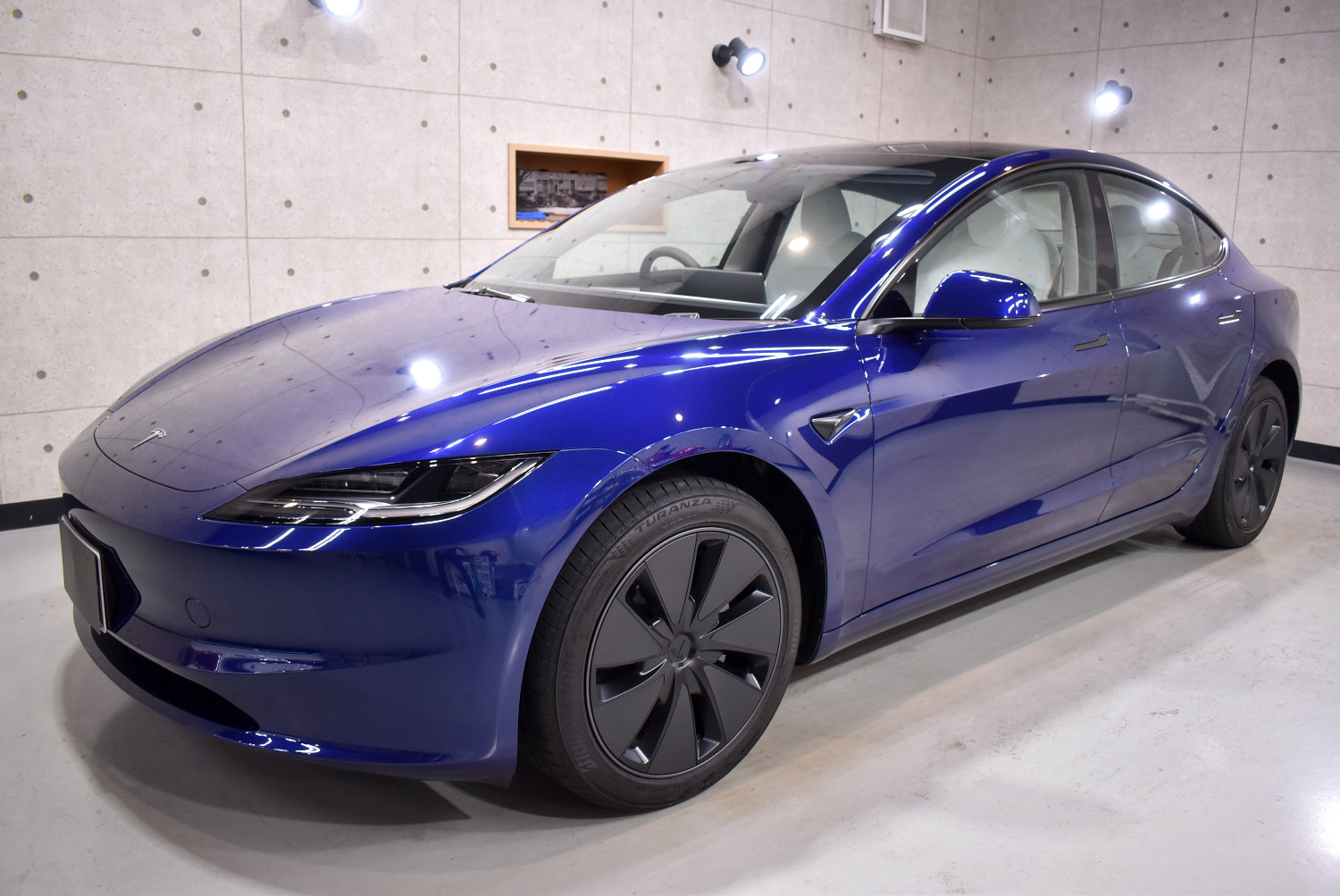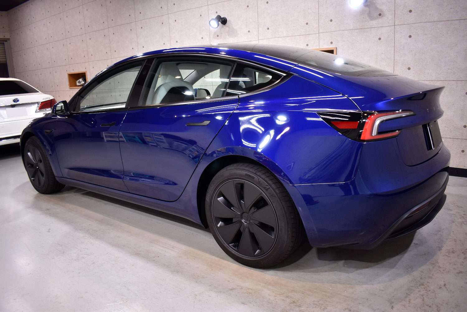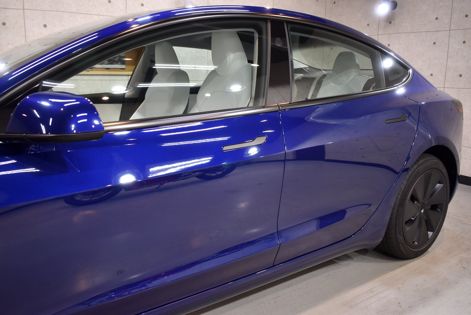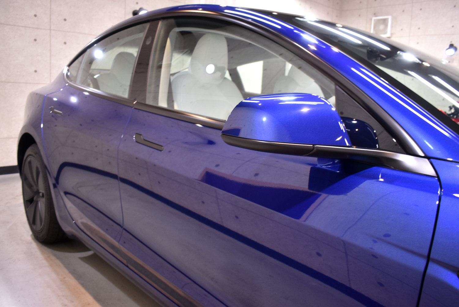 ディープブルーメタリックが放つ深く鮮やかな輝きに、セラミックコーティングが重なることで、まるで宝石のような艶をまとったテスラ・モデル3に生まれ変わりました。
