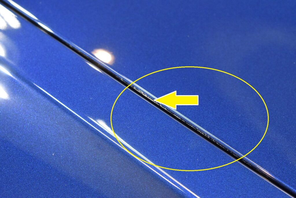 新車であっても、納車段階で保護シートの糊跡や微細なくもり、微キズが残っているケースは少なくありません。今回のモデル3も同様に、ボンネットやドア部に軽い保護シートの糊残りが見受けられました。