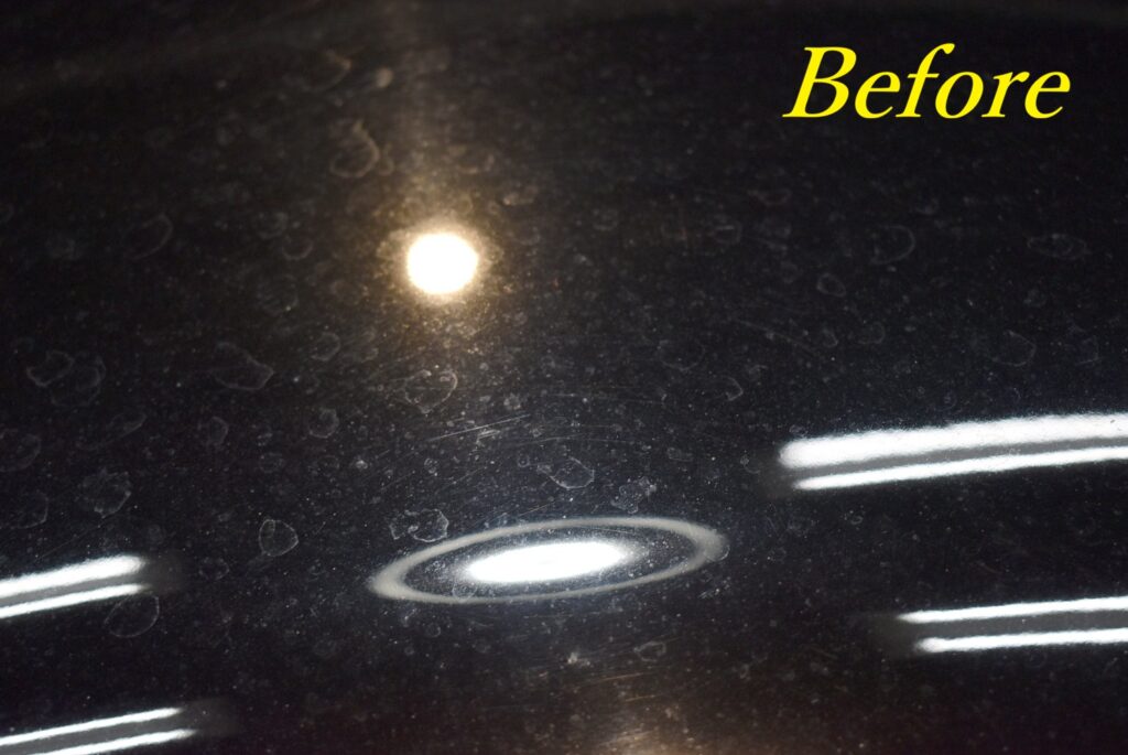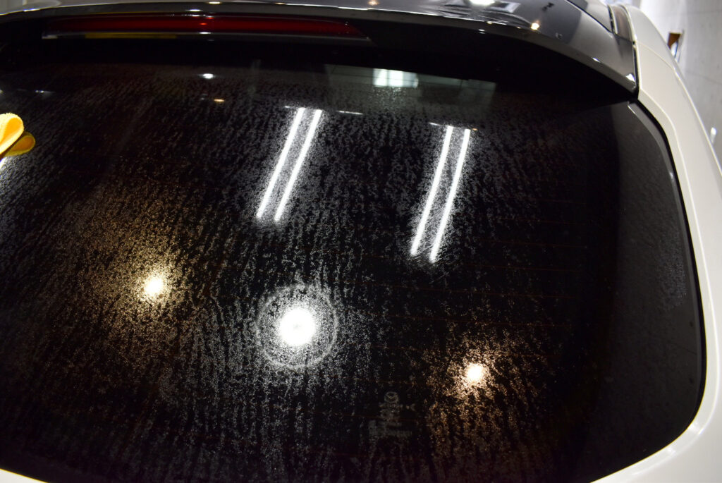 ご入庫時の窓ガラスには、ウロコ状の雨ジミが広範囲に付着しており、ほとんど撥水していない状態でした。一見するとそこまでひどくないようにも見えますが、ライトを当てて角度を変えると、フロント・リアともに細かなウロコが面で広がっているのが分かります。