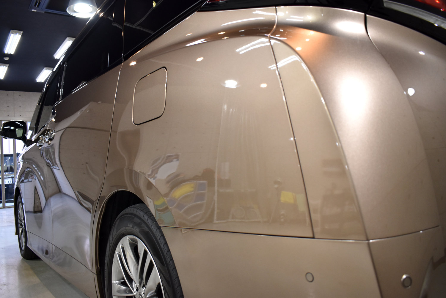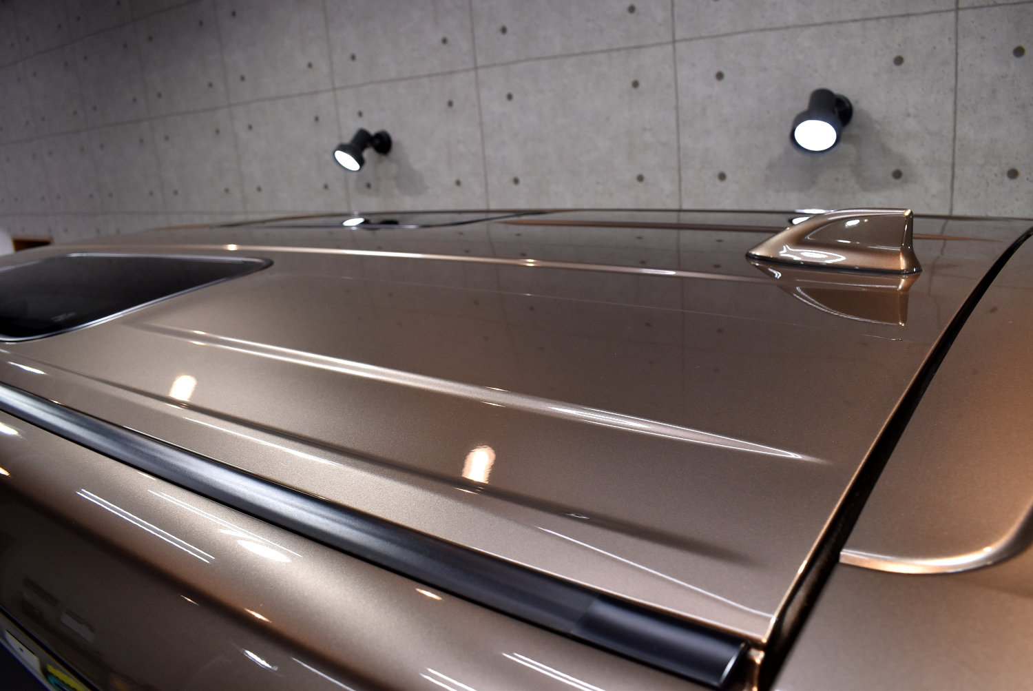 そして、今回施工させていただいたボディカラー「プレシャスレオブロンド」。これが本当にかっこいい。 派手なゴールドではなく、光の当たり方によってシャンパンゴールドのようにも、深みのあるブロンズにも表情を変えます。このカラーは、塗装状態の良し悪しが非常に分かりやすいため、下地処理とコーティングの完成度が、そのまま美しさに直結します。だからこそ、私たち磨き専門店の腕が試されるカラーでもあります。