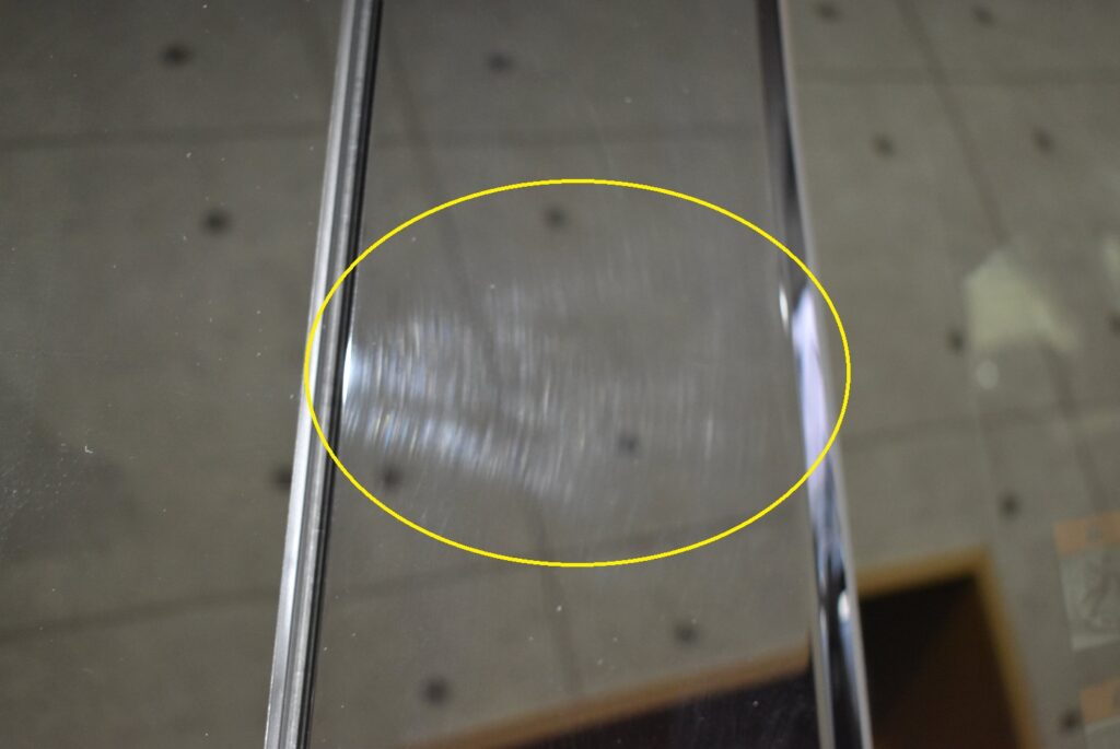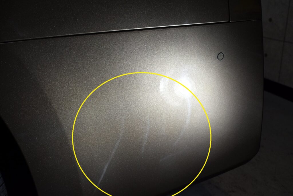 今回の個体は2024年式と非常に新しいお車でしたが、納車前に板金修理を依頼したリアバンパーに「オーロラ傷(磨き跡)」が確認できました。板金修理の仕上げの磨きによって発生したポリッシングによるものです。
